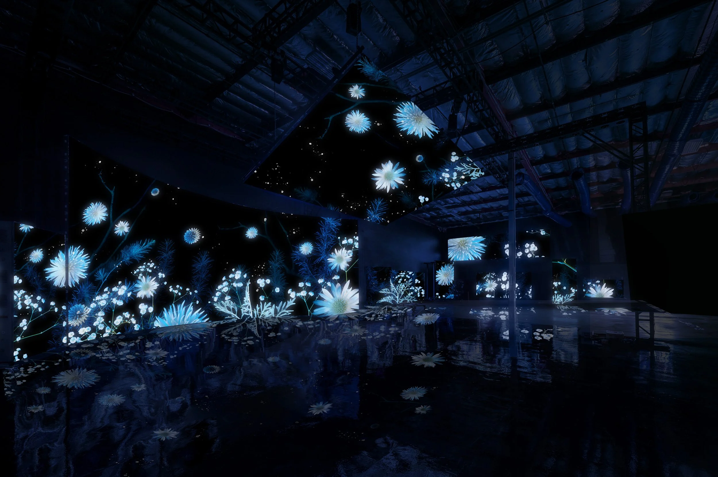 Los Angeles–based artist Maggie West presents Frost, a new immersive installation that transforms time-lapse photography into a luminous winter dreamscape. Using her signature approach of layered imagery and colored lighting, West reimagines delicate branches and silvery leaves in icy tones of blue and white. Displayed across expansive digital screens, these shifting landscapes unfold like a frozen garden slowly coming to life, inviting audiences to step inside a serene world of pale light and delicate blooms.