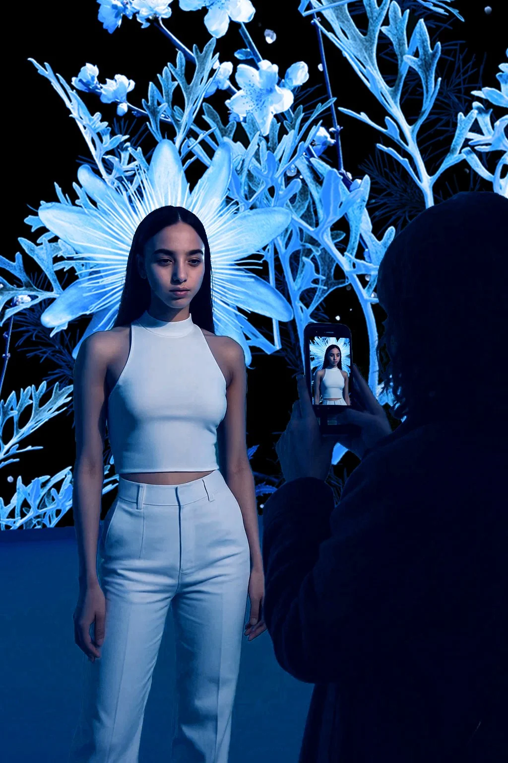 Following the success of her previous exhibition at SV Studios, West returns to the Los Angeles venue with Frost, a new seasonal installation. Known for transforming vast screens into immersive environments of color and movement, West now shifts her focus to a winter aesthetic, reimagining delicate branches and silvery leaves in icy tones of blue and white. This new body of work transforms the studio’s high-resolution LED environment into a luminous frozen garden, enveloping audiences in a serene, dreamlike atmosphere that contrasts yet complements the vibrancy of her earlier presentation there.