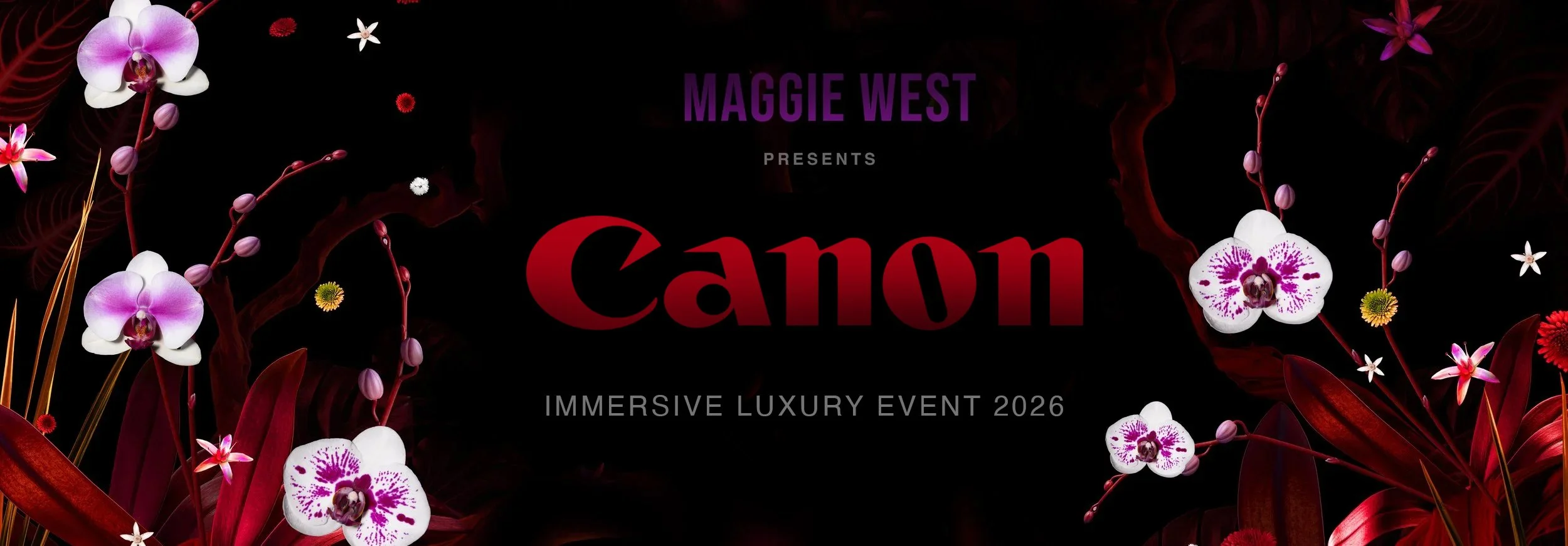 The debut of TROPICS will be celebrated with a private VIP opening event presented by Canon, bringing together a curated guest list that includes many of Canon’s leading creators and influencers. Set within a lush and immersive environment, attendees will be surrounded by vivid botanical imagery and deep saturated color, experiencing the work in a setting designed to feel both vibrant and refined. The rich palette of reds, magentas, and gold tones creates an atmosphere of energy and celebration while maintaining a sense of elegance and sophistication, in line with the high production value of Canon’s premier events.