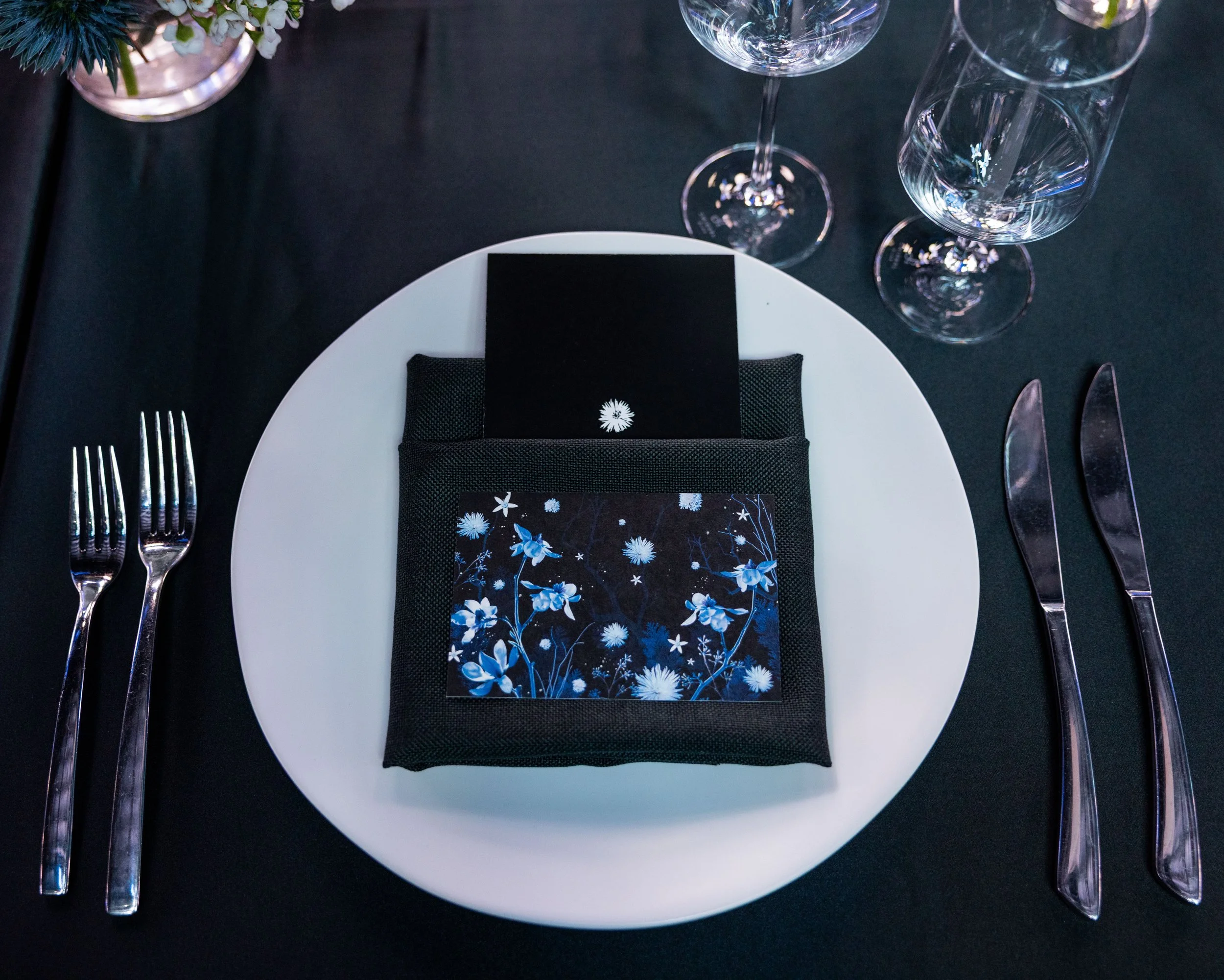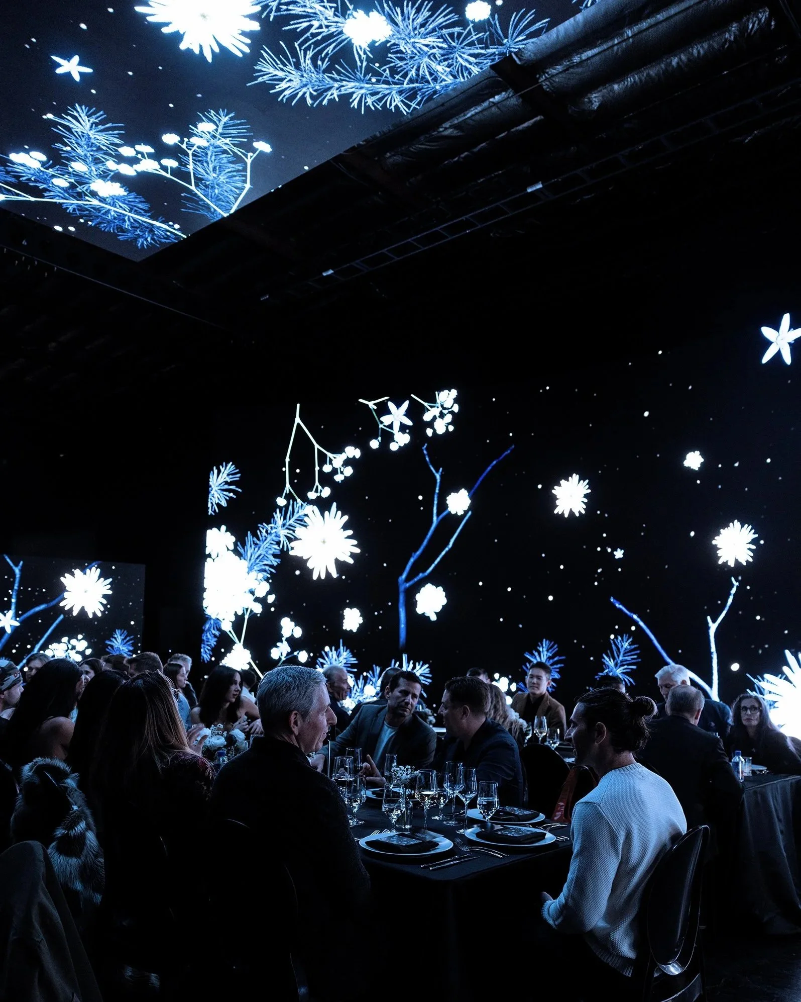 The event was designed as a luxury experience that reflected the visual language of the exhibition. A custom menu and cocktails were created for the evening, while floral arrangements were carefully designed to echo the cool tones and botanical forms seen in the work itself. The result was an immersive environment where every detail of the evening, from the décor to the atmosphere of the room, extended the aesthetic of FROST and created a refined setting for the installation’s debut.