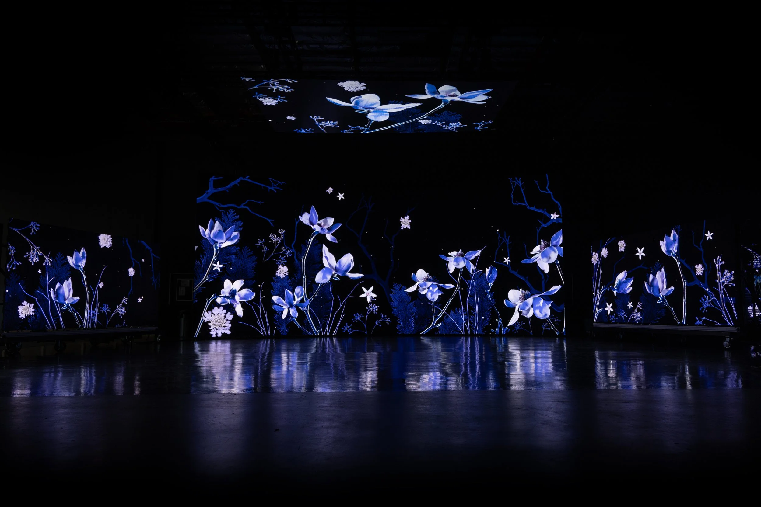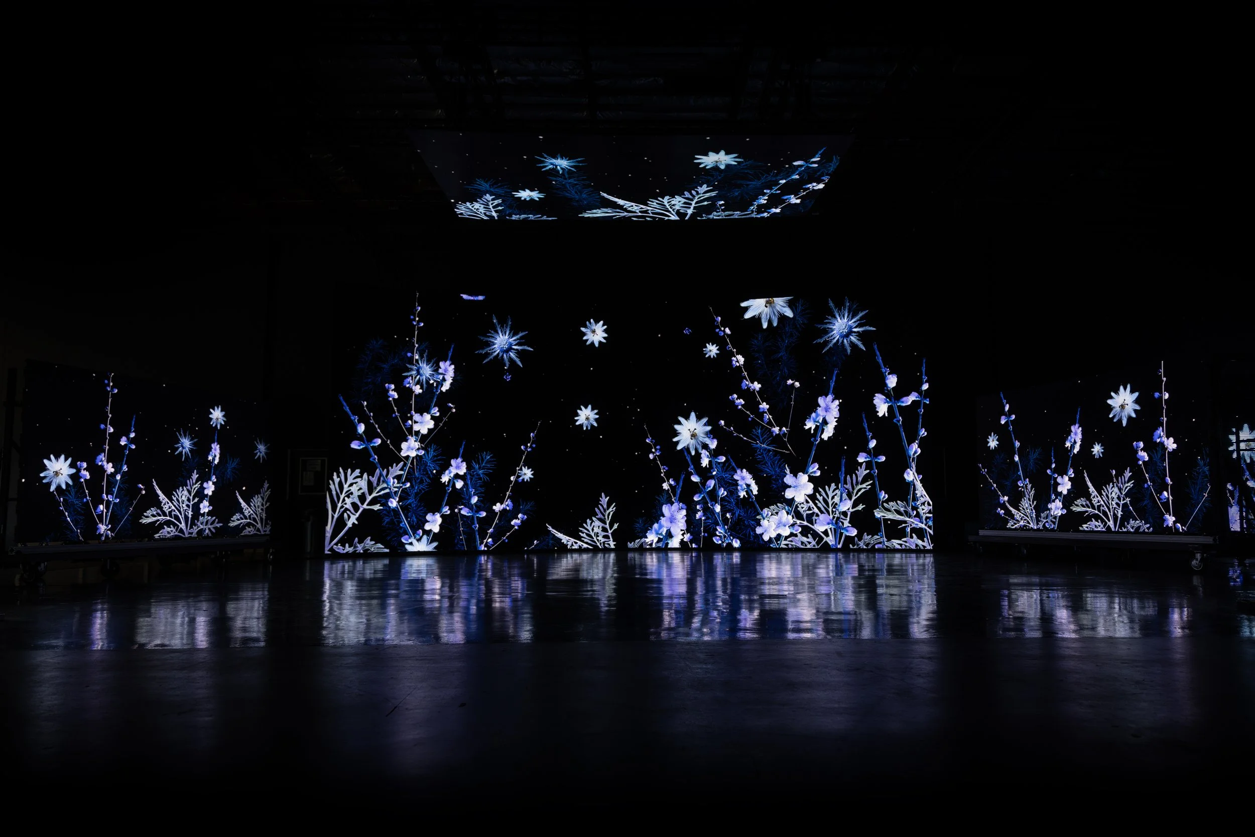 The architecture of SV Studios made it possible for viewers to move through the installation and experience the work from multiple perspectives. The combination of high resolution LED technology and a darkened interior created a vivid atmosphere where the glowing imagery became the primary source of light in the room. Within this setting, FROST unfolded as an immersive environment that invited audiences to step inside a winter world constructed from living botanical motion.