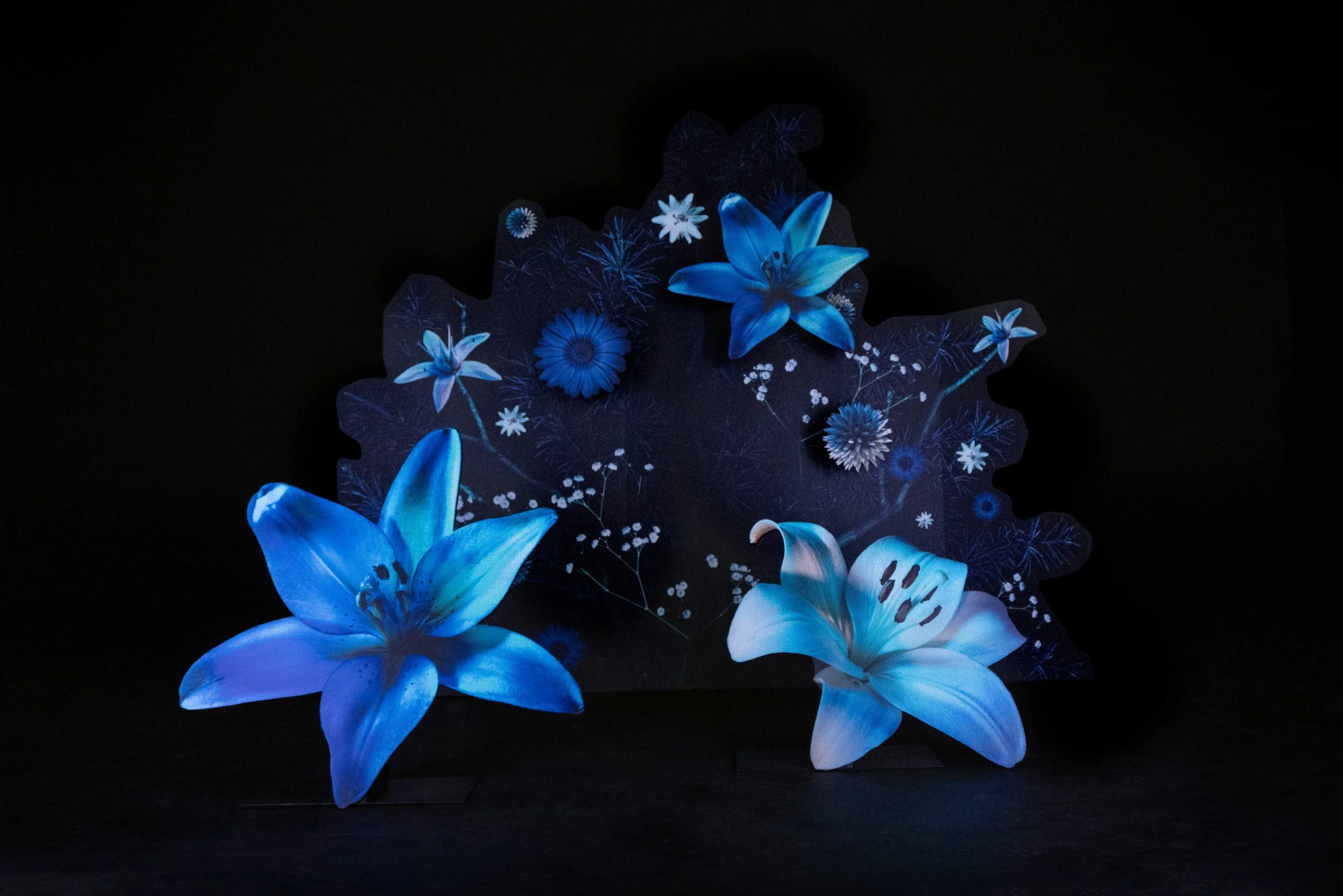 Alongside the digital installation, West created a physical scenic environment designed to echo the imagery within the work. Sculptural elements, materials, and atmospheric lighting were arranged to reflect the icy palette and botanical forms seen in the video, allowing the space itself to feel like an extension of the frozen landscape on screen. This physical installation served as a counterpart to the digital imagery, grounding the luminous winter scenes in a tangible environment that visitors could move through and experience in person.